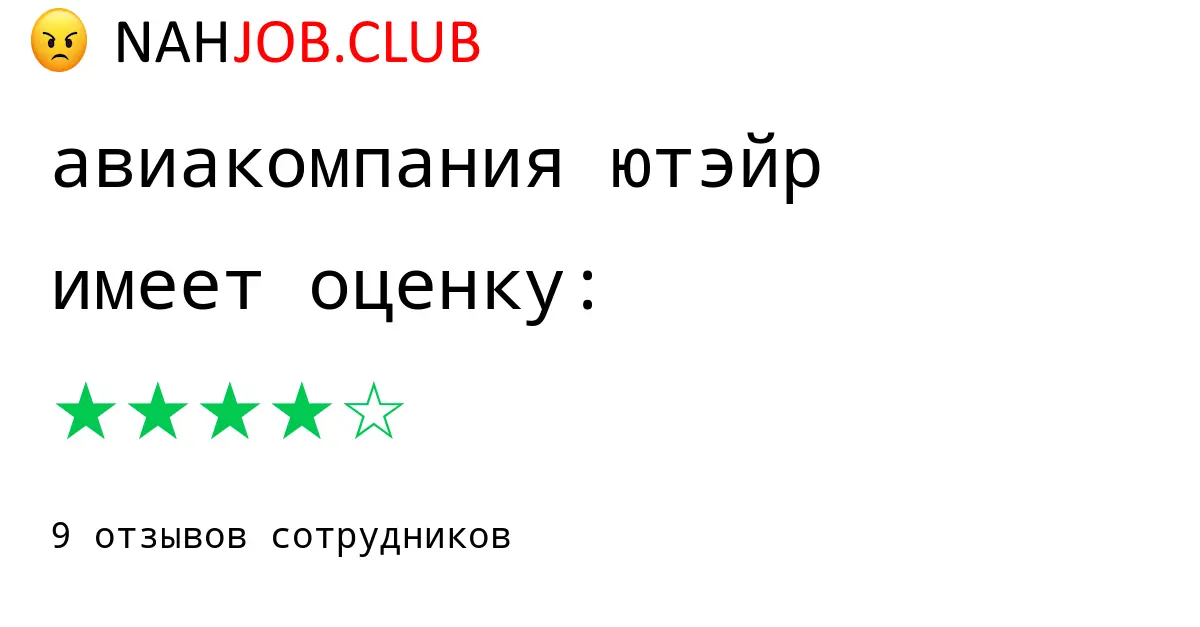 🔴 Мы собрали 9 отзывов бывших сотрудников про АВИАКОМПАНИЯ ЮТЭЙР с рейтингом 4 из 5 . Это данные изнутри про зарплату, коллектив, штрафы.