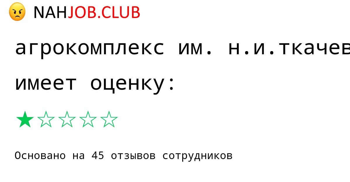 🔴 В базе Nahjob 45 отзывов и мнений бывших и действующих работников про АГРОКОМПЛЕКС ИМ. Н.И.ТКАЧЕВА с рейтингом 1 из 5 . Это реальные отклики про зп, атмосферу, штрафы.