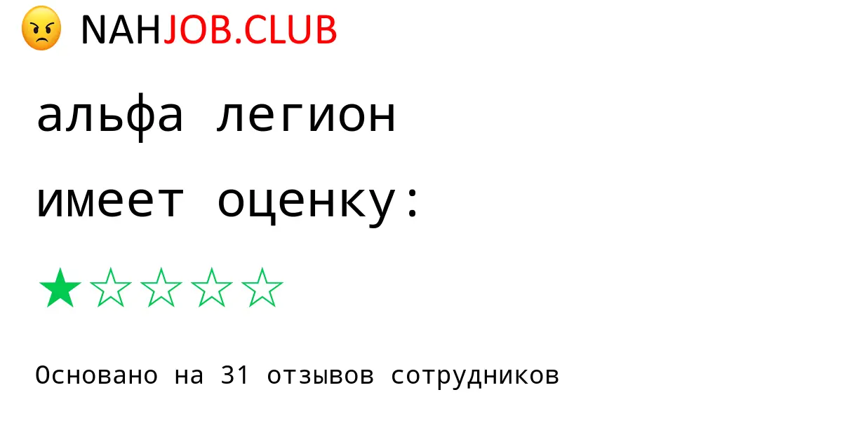 🔴 Мы собрали 1 отзыв бывших сотрудников про АЛЬФА ЛЕГИОН по городу Казань с рейтингом 1 из 5 . Это данные изнутри про зарплату, коллектив, штрафы.