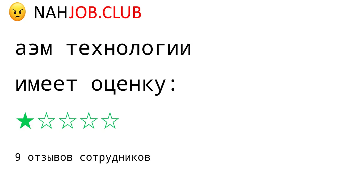 🔴 В базе Nahjob 9 отзывов и мнений бывших и действующих работников про АЭМ ТЕХНОЛОГИИ с рейтингом 1 из 5 . Это реальные отклики про зп, атмосферу, штрафы.