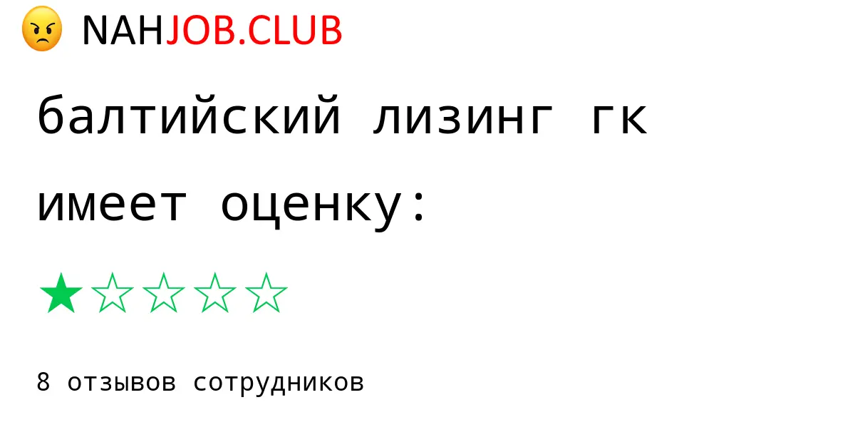🔴 В базе Nahjob 2 отзыва и мнений бывших и действующих работников про БАЛТИЙСКИЙ ЛИЗИНГ ГК по городу Москва с рейтингом 1 из 5 . Это реальные отклики про зп, атмосферу, штрафы.