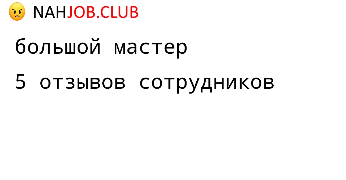 🔴 Мы собрали 5 отзывов бывших сотрудников про БОЛЬШОЙ МАСТЕР по городу Москва . Это данные изнутри про зарплату, коллектив, штрафы.