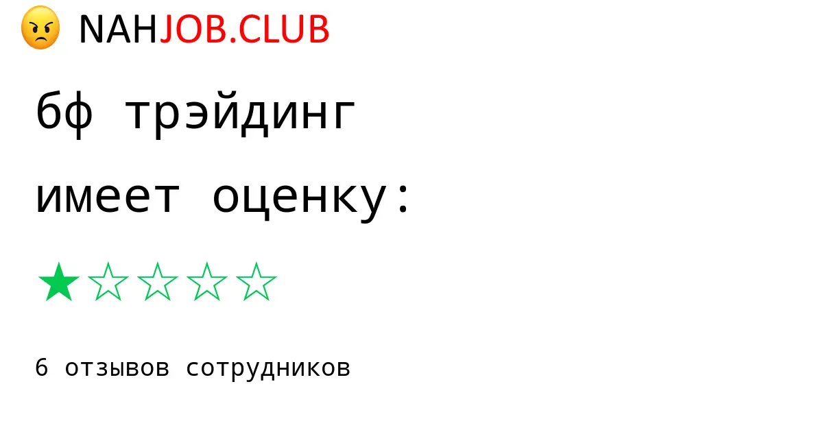 🔴 В базе Nahjob 6 отзывов и мнений бывших и действующих работников про БФ ТРЭЙДИНГ по городу Минск с рейтингом 1 из 5 . Это реальные отклики про зп, атмосферу, штрафы.