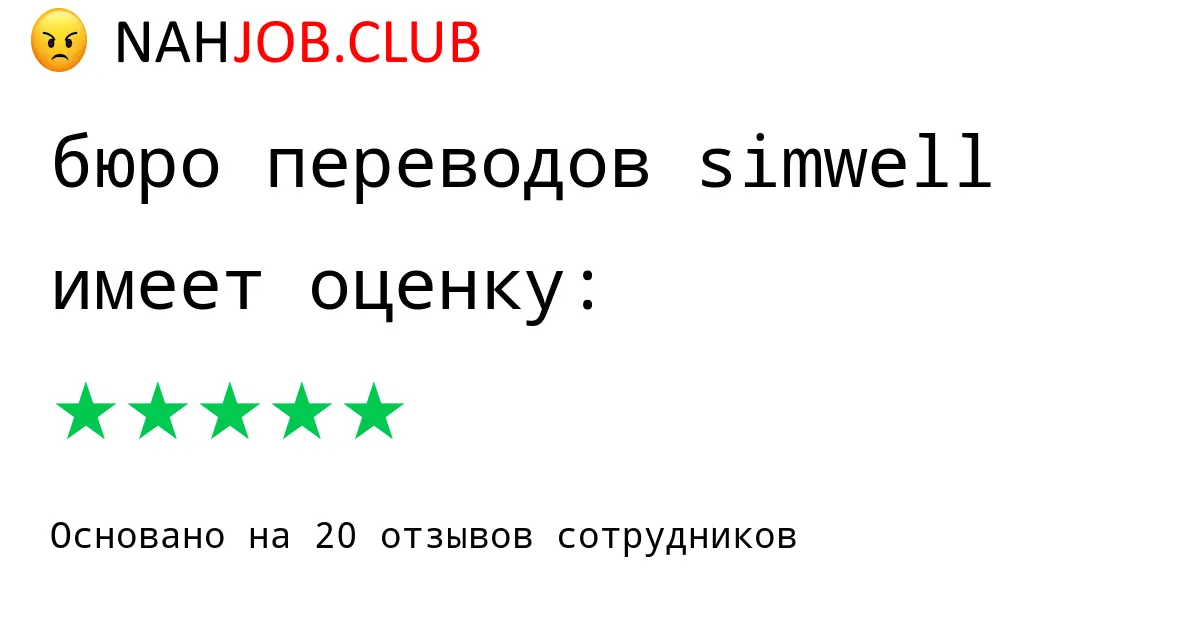 🔴 В базе Nahjob 20 отзывов и мнений бывших и действующих работников про БЮРО ПЕРЕВОДОВ SIMWELL с рейтингом 5 из 5 . Это реальные отклики про зп, атмосферу, штрафы.