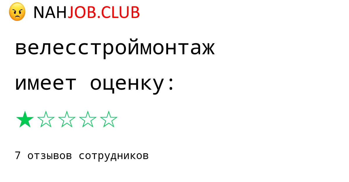 🔴 В базе Nahjob 1 отзыв и мнений бывших и действующих работников про ВЕЛЕССТРОЙМОНТАЖ по городу Краснодар . Это реальные отклики про зп, атмосферу, штрафы.