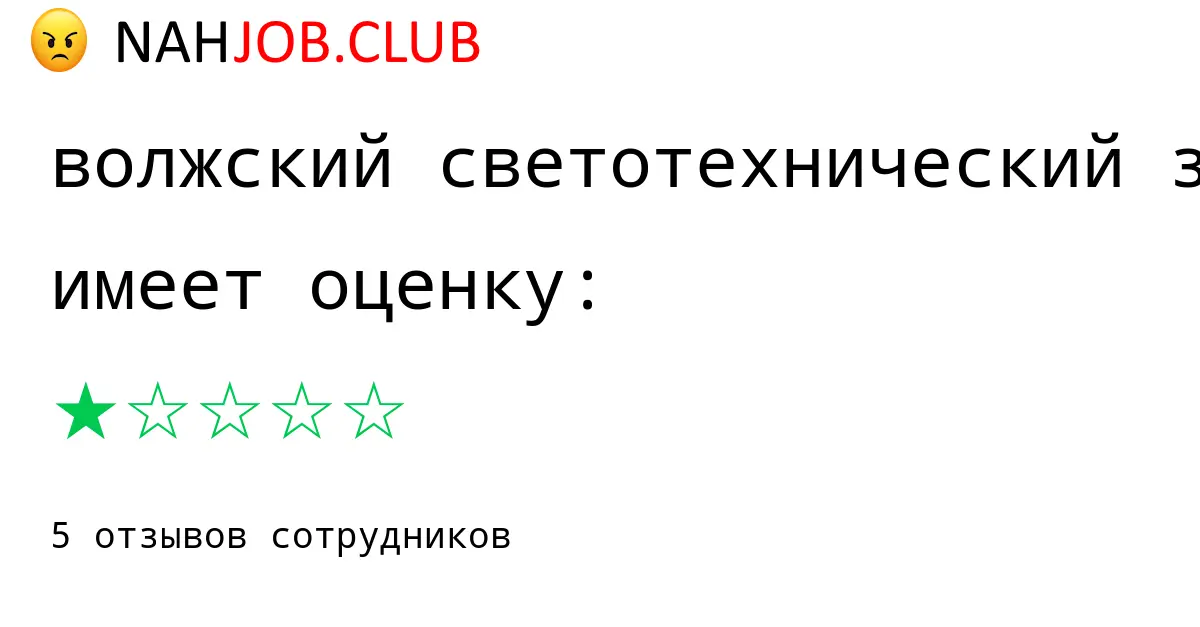 🔴 Мы собрали 5 отзывов бывших сотрудников про ВОЛЖСКИЙ СВЕТОТЕХНИЧЕСКИЙ ЗАВОД ЛУЧ с рейтингом 1 из 5 . Это данные изнутри про зарплату, коллектив, штрафы.