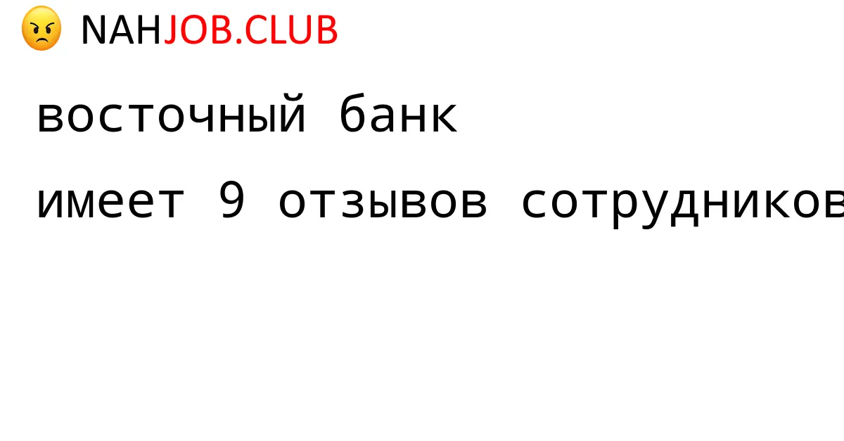🔴 В базе Nahjob 1 отзыв и мнений бывших и действующих работников про ВОСТОЧНЫЙ БАНК по городу Новосибирск . Это реальные отклики про зп, атмосферу, штрафы.