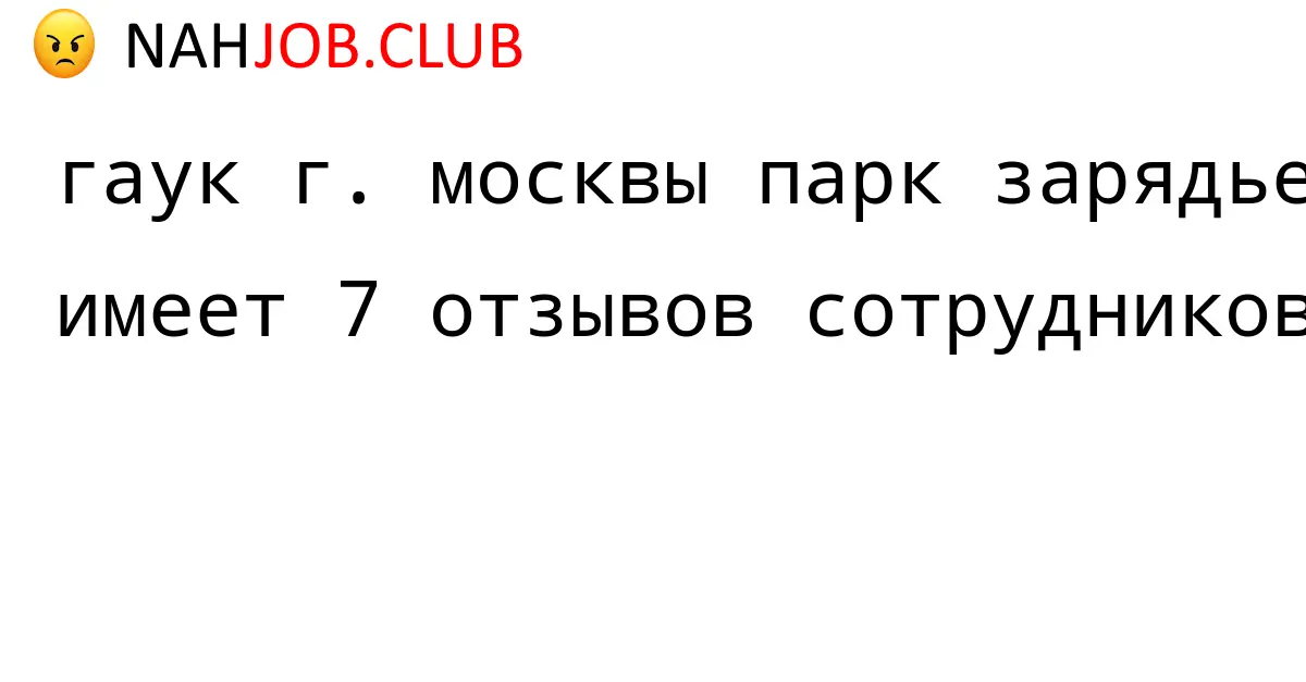 🔴 В базе Nahjob 6 отзывов и мнений бывших и действующих работников про ГАУК Г. МОСКВЫ ПАРК ЗАРЯДЬЕ. Это реальные отклики про зп, атмосферу, штрафы.