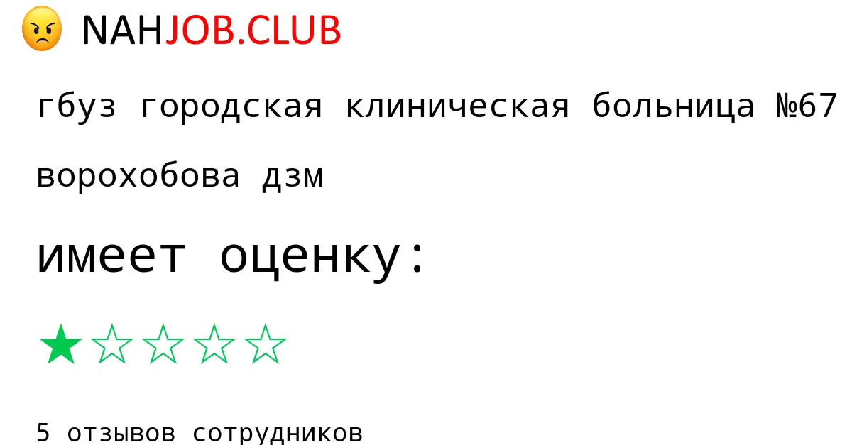 🔴 Изучаете вакансию администратор компании ГБУЗ ГОРОДСКАЯ КЛИНИЧЕСКАЯ БОЛЬНИЦА №67 ИМ. Л.А. ВОРОХОБОВА ДЗМ? Почитайте 1 отзыв бывших сотрудников про работу по должности Администратор в ГБУЗ ГОРОДСКАЯ КЛИНИЧЕСКАЯ БОЛЬНИЦА №67 ИМ. Л.А. ВОРОХОБОВА ДЗМ