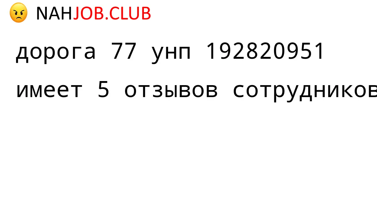 🔴 В базе Nahjob 5 отзывов и мнений бывших и действующих работников про ДОРОГА 77 УНП 192820951. Это реальные отклики про зп, атмосферу, штрафы.