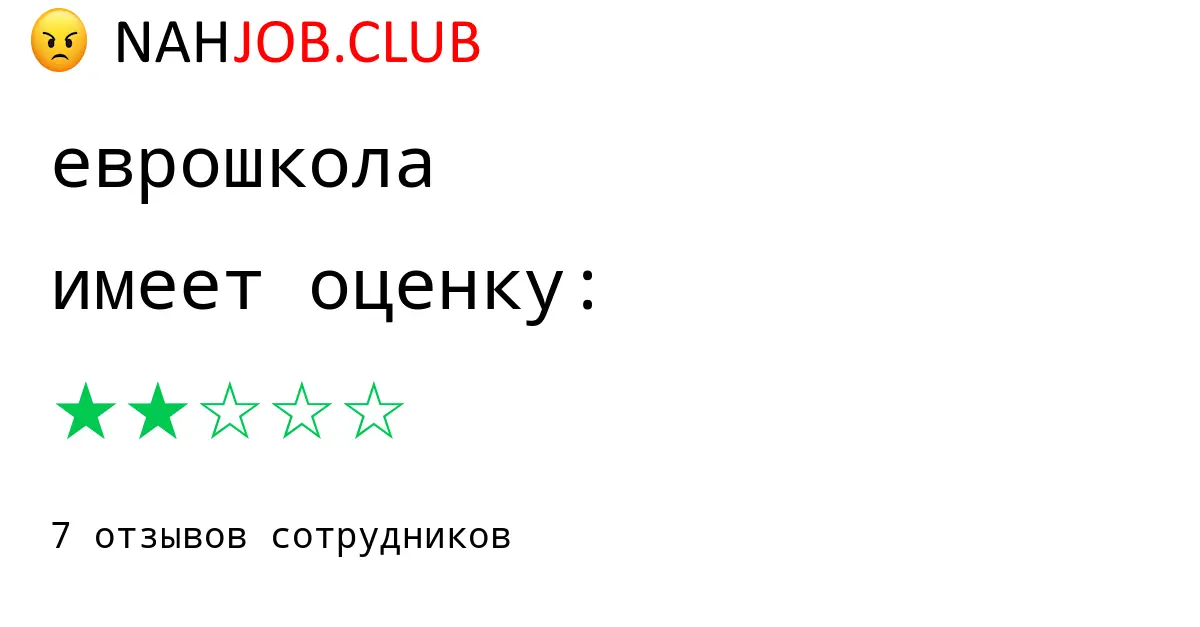 🔴 В базе Nahjob 1 отзыв и мнений бывших и действующих работников про ЕВРОШКОЛА по городу Москва с рейтингом 2 из 5 . Это реальные отклики про зп, атмосферу, штрафы.