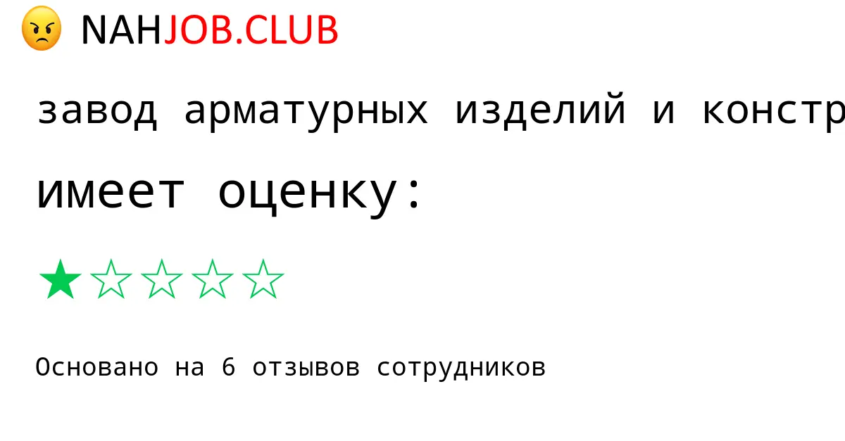 🔴 Мы собрали 1 отзыв бывших сотрудников про ЗАВОД АРМАТУРНЫХ ИЗДЕЛИЙ И КОНСТРУКЦИЙ АРМИКОН по городу Челябинск . Это данные изнутри про зарплату, коллектив, штрафы.