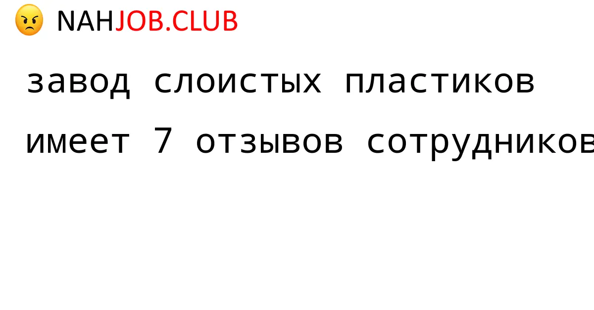 🔴 В базе Nahjob 1 отзыв и мнений бывших и действующих работников про ЗАВОД СЛОИСТЫХ ПЛАСТИКОВ по городу Архангельск . Это реальные отклики про зп, атмосферу, штрафы.