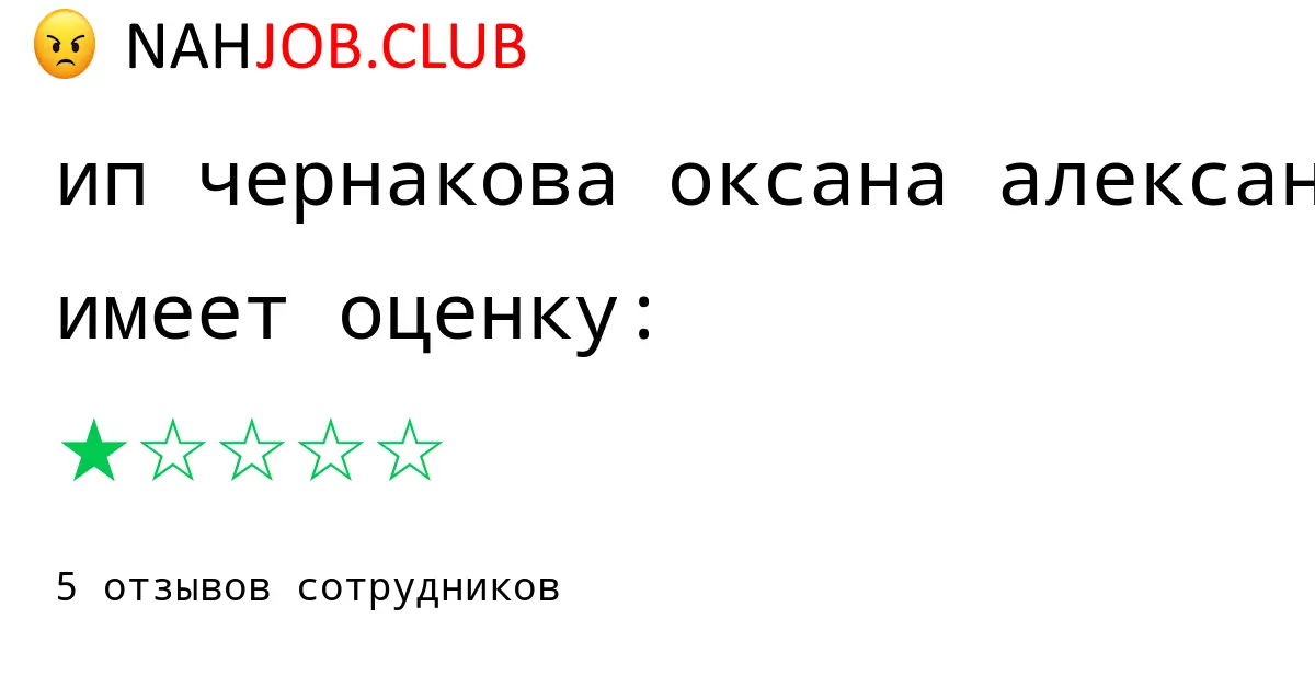 🔴 В базе Nahjob 5 отзывов и мнений бывших и действующих работников про ЧЕРНАКОВА ОКСАНА АЛЕКСАНДРОВНА с рейтингом 1 из 5 . Это реальные отклики про зп, атмосферу, штрафы.