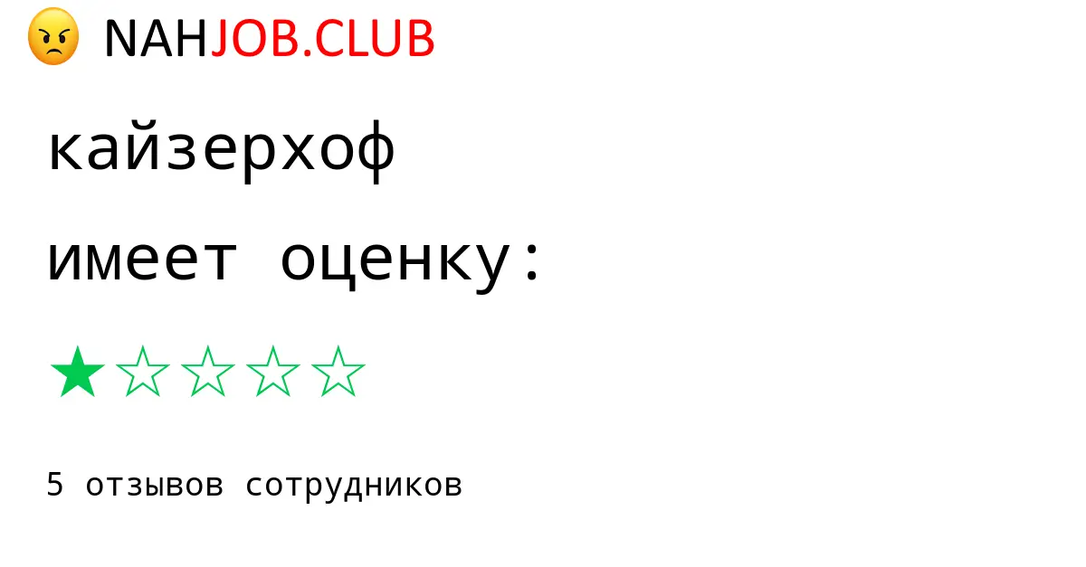 🔴 Мы собрали 5 отзывов бывших сотрудников про КАЙЗЕРХОФ с рейтингом 1.3 из 5 . Это данные изнутри про зарплату, коллектив, штрафы.