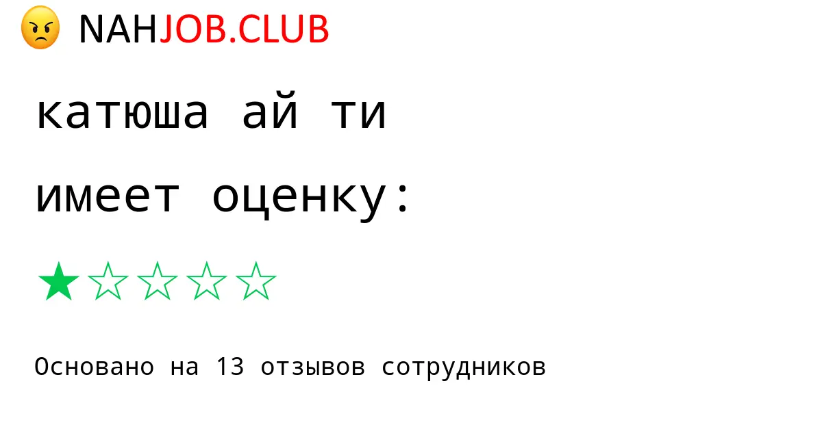 🔴 В базе Nahjob 11 отзывов и мнений бывших и действующих работников про КАТЮША АЙ ТИ по городу Москва с рейтингом 1 из 5 . Это реальные отклики про зп, атмосферу, штрафы.