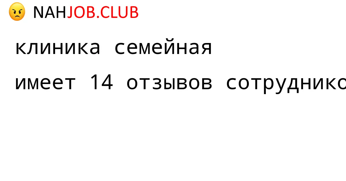 🔴 В базе Nahjob 14 отзывов и мнений бывших и действующих работников про КЛИНИКА СЕМЕЙНАЯ по городу Москва . Это реальные отклики про зп, атмосферу, штрафы.