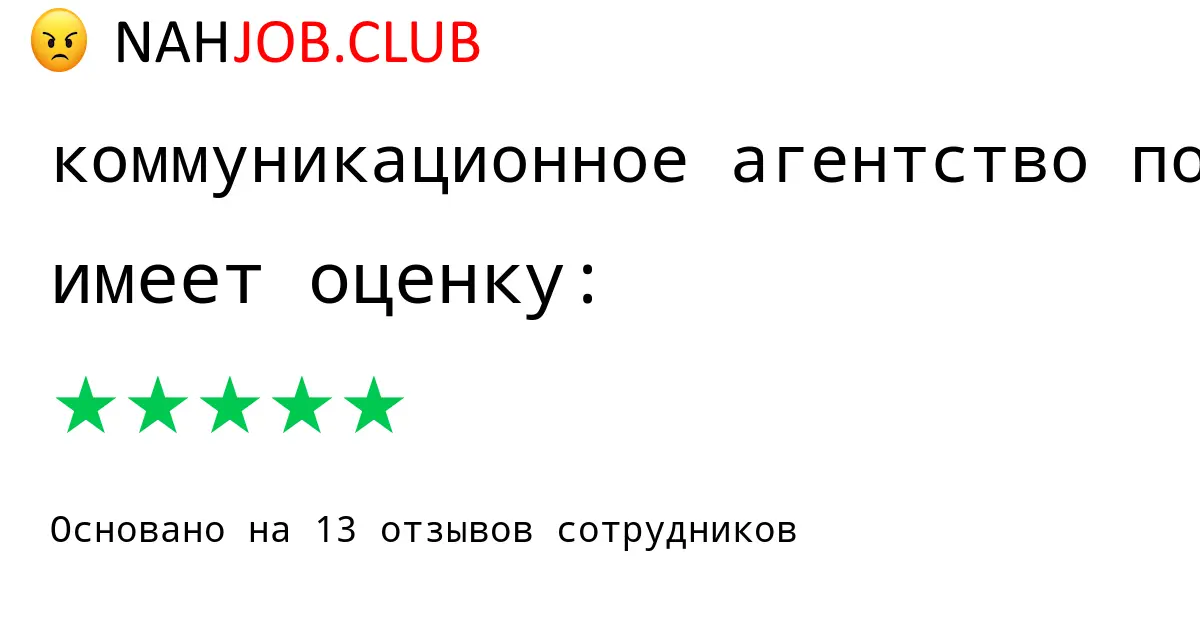 ✓ ПреимуществаДиректор иногда умеет смеяться, может повезти с коллективом Далее →✗ НедостаткиЯ пришла работать в агентство, когда за спиной еще не было никакого серьезного опыта, соответственно, понимания, как должна выглядеть адекватная атмосфера в команде, тоже не было. Мой совет тем, кто сейчас только начинает свой путь: ищите другие вакансии. Работа в пиаре может быть интересной, но только не в этом агентстве. Старые компьютеры, маленький офис, постоянный контроль за каждым чихом, угрюмая атмосфера, штрафы, каждый день надо будет сдавать отчет, чем вы сегодня занимались, на который первое время будет уходить минимум час. Пиар — это про современность, нестандартный подход, новые идеи, креативность, динамику. В такой атмосфере очень сложно будет развить такие качества. И, судя по отзывам, директор игнорирует обратную связь сотрудников и никак не хочет улучшать что-то. Поэтому не теряйте время. Ищите дальше. Далее →