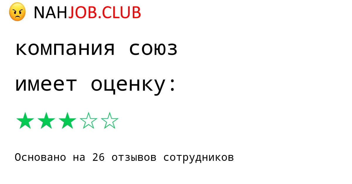 🔴 В базе Nahjob 26 отзывов и мнений бывших и действующих работников про СОЮЗ с рейтингом 3 из 5 . Это реальные отклики про зп, атмосферу, штрафы.