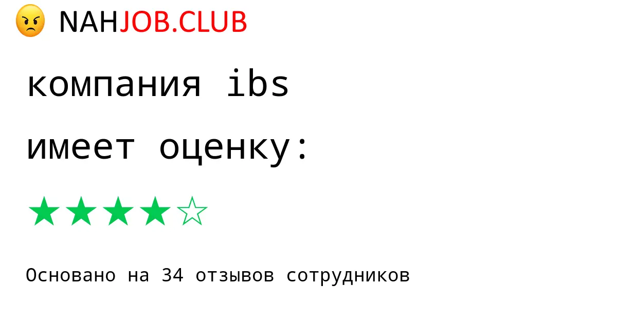 🔴 В базе Nahjob 24 отзыва и мнений бывших и действующих работников про IBS по городу Москва с рейтингом 4 из 5 . Это реальные отклики про зп, атмосферу, штрафы.