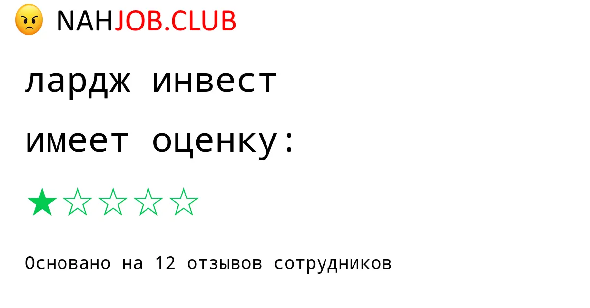 🔴 В базе Nahjob 12 отзывов и мнений бывших и действующих работников про ЛАРДЖ ИНВЕСТ с рейтингом 1 из 5 . Это реальные отклики про зп, атмосферу, штрафы.