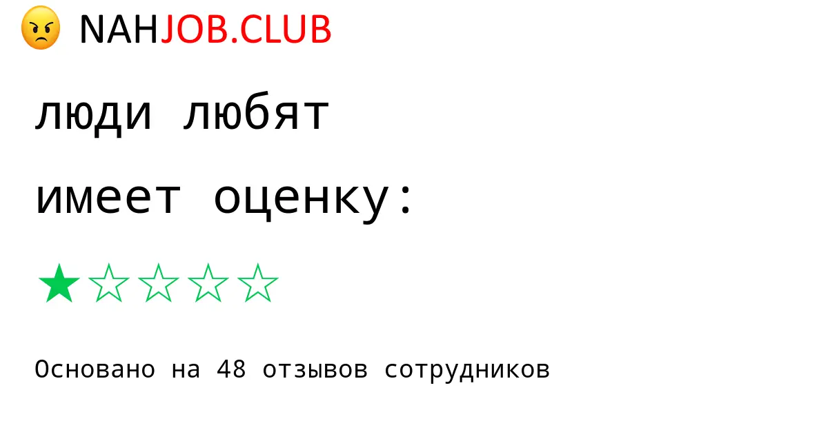 🔴 В базе Nahjob 48 отзывов и мнений бывших и действующих работников про ЛЮДИ ЛЮБЯТ с рейтингом 1 из 5 . Это реальные отклики про зп, атмосферу, штрафы.