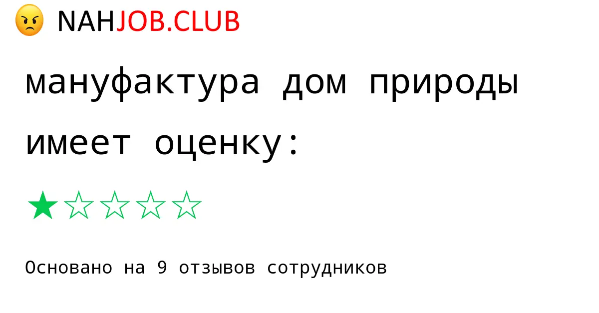 🔴 Мы собрали 1 отзыв бывших сотрудников про МАНУФАКТУРА ДОМ ПРИРОДЫ по городу Красноармейск . Это данные изнутри про зарплату, коллектив, штрафы.