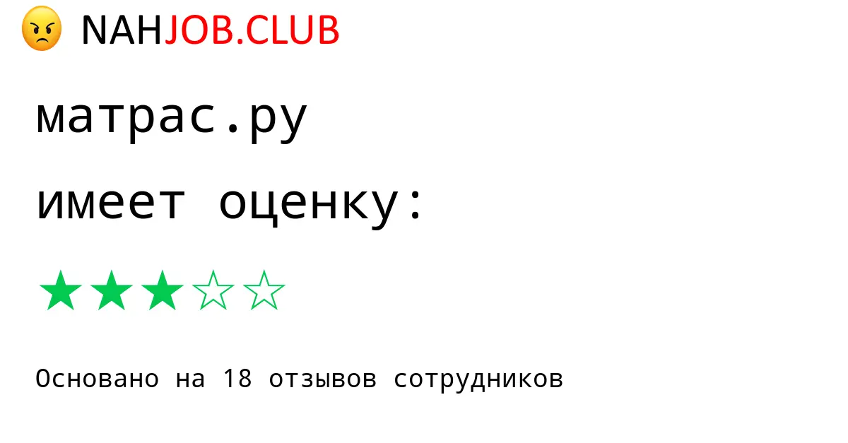 🔴 В базе Nahjob 5 отзывов и мнений бывших и действующих работников про МАТРАС.РУ по городу Санкт-Петербург с рейтингом 3.5 из 5 . Это реальные отклики про зп, атмосферу, штрафы.