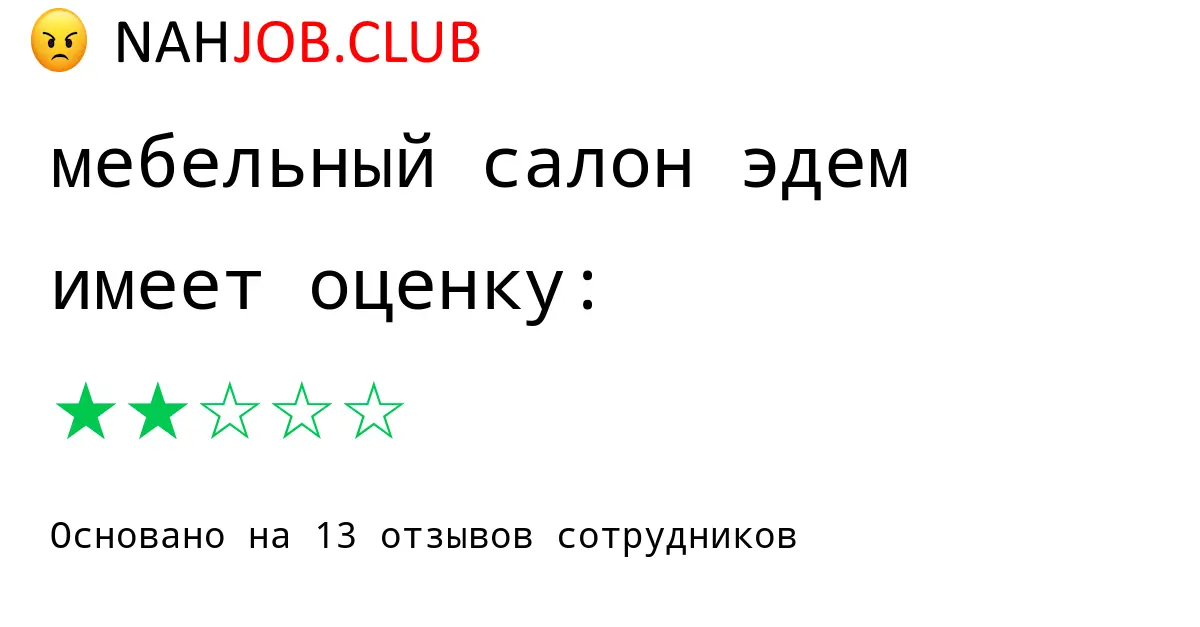 🔴 Изучаете вакансию менеджер компании МЕБЕЛЬНЫЙ САЛОН ЭДЕМ? Почитайте 2 отзыва бывших сотрудников про работу по должности Менеджер в МЕБЕЛЬНЫЙ САЛОН ЭДЕМ