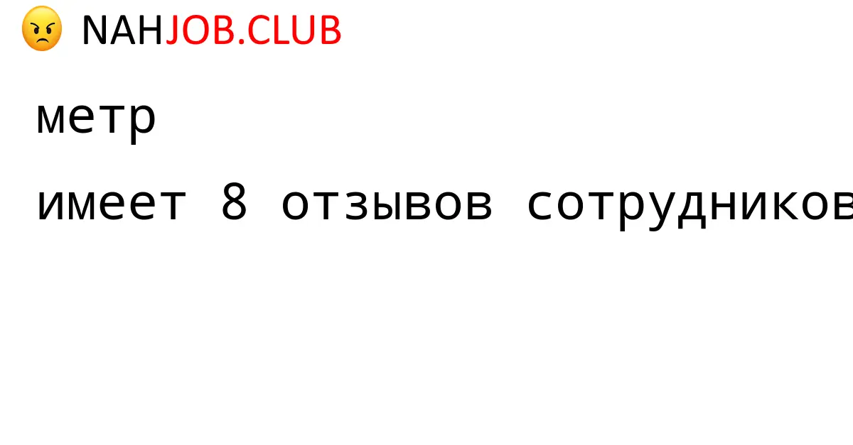 🔴 В базе Nahjob 1 отзыв и мнений бывших и действующих работников про МЕТР по городу Тольятти . Это реальные отклики про зп, атмосферу, штрафы.