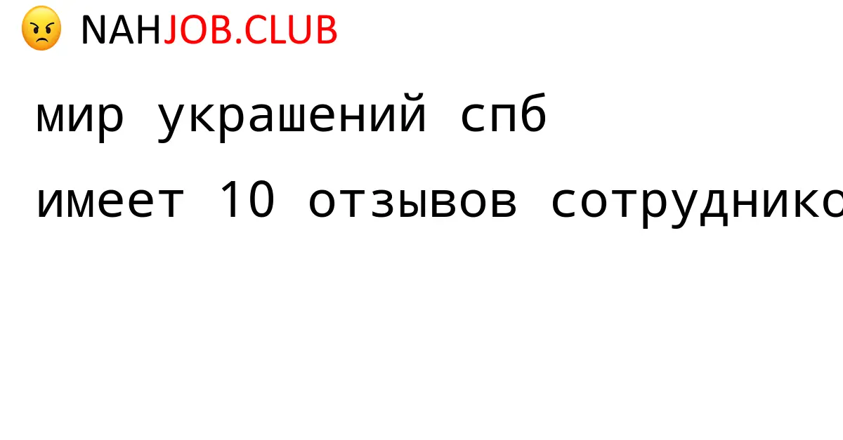 🔴 В базе Nahjob 10 отзывов и мнений бывших и действующих работников про МИР УКРАШЕНИЙ СПБ. Это реальные отклики про зп, атмосферу, штрафы.