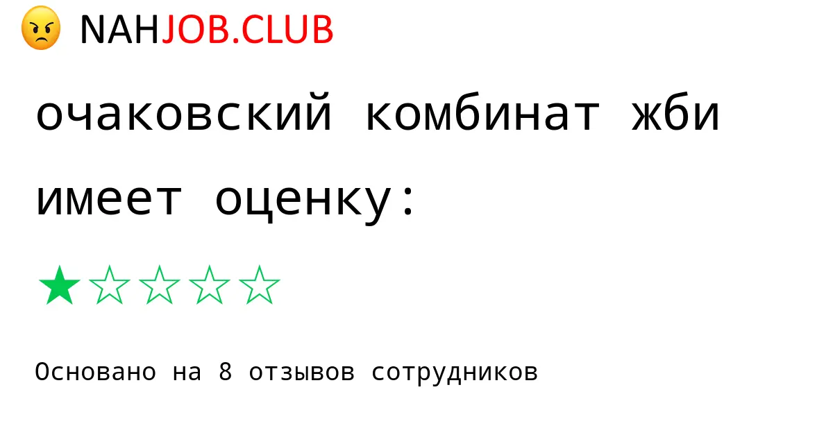 🔴 В базе Nahjob 8 отзывов и мнений бывших и действующих работников про ОЧАКОВСКИЙ КОМБИНАТ ЖБИ с рейтингом 1 из 5 . Это реальные отклики про зп, атмосферу, штрафы.