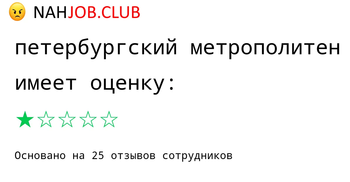 🔴 Изучаете вакансию начальник цеха компании ПЕТЕРБУРГСКИЙ МЕТРОПОЛИТЕН? Почитайте 1 отзыв бывших сотрудников про работу по должности Начальник цеха в ПЕТЕРБУРГСКИЙ МЕТРОПОЛИТЕН