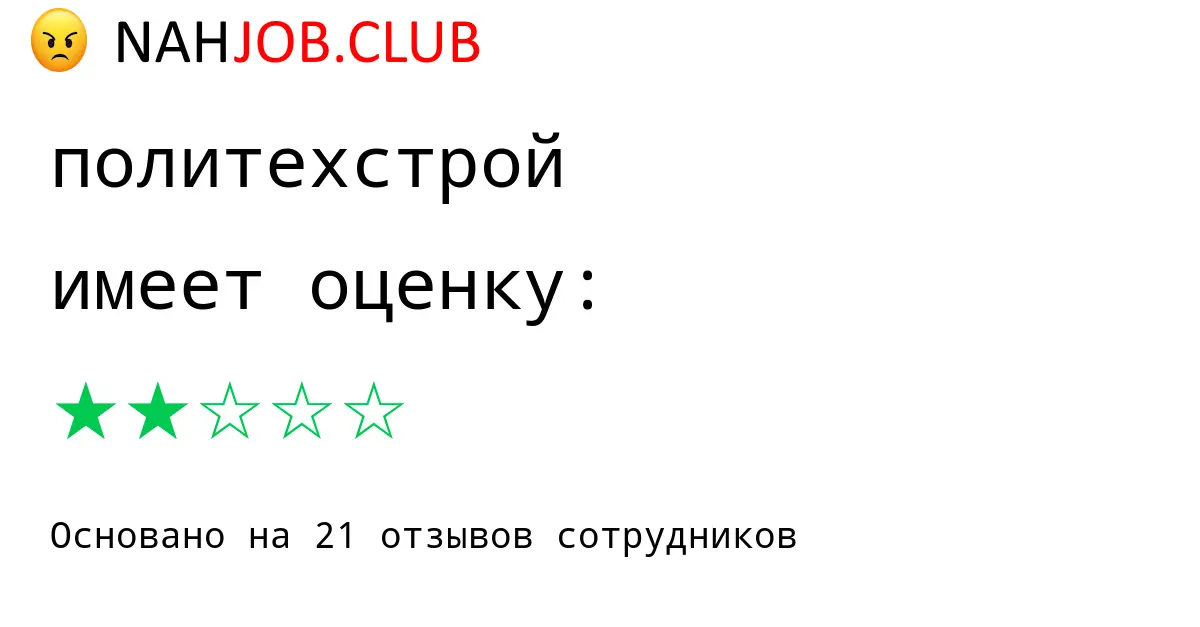 🔴 В списке 14 отзывов бывших работников про ПОЛИТЕХСТРОЙ по городу Москва с рейтингом 2.6 из 5 . Это искренние мнения про атмосферу, доходы, штрафы, отпуска.