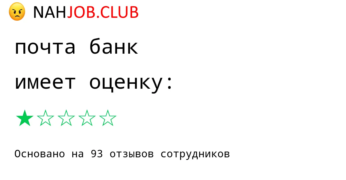 🔴 В базе Nahjob 92 отзыва и мнений бывших и действующих работников про ПОЧТА БАНК с рейтингом 1 из 5 . Это реальные отклики про зп, атмосферу, штрафы.