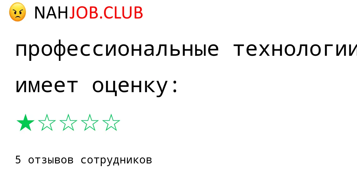 🔴 Мы собрали 5 отзывов бывших сотрудников про ПРОФЕССИОНАЛЬНЫЕ ТЕХНОЛОГИИ с рейтингом 1 из 5 . Это данные изнутри про зарплату, коллектив, штрафы.