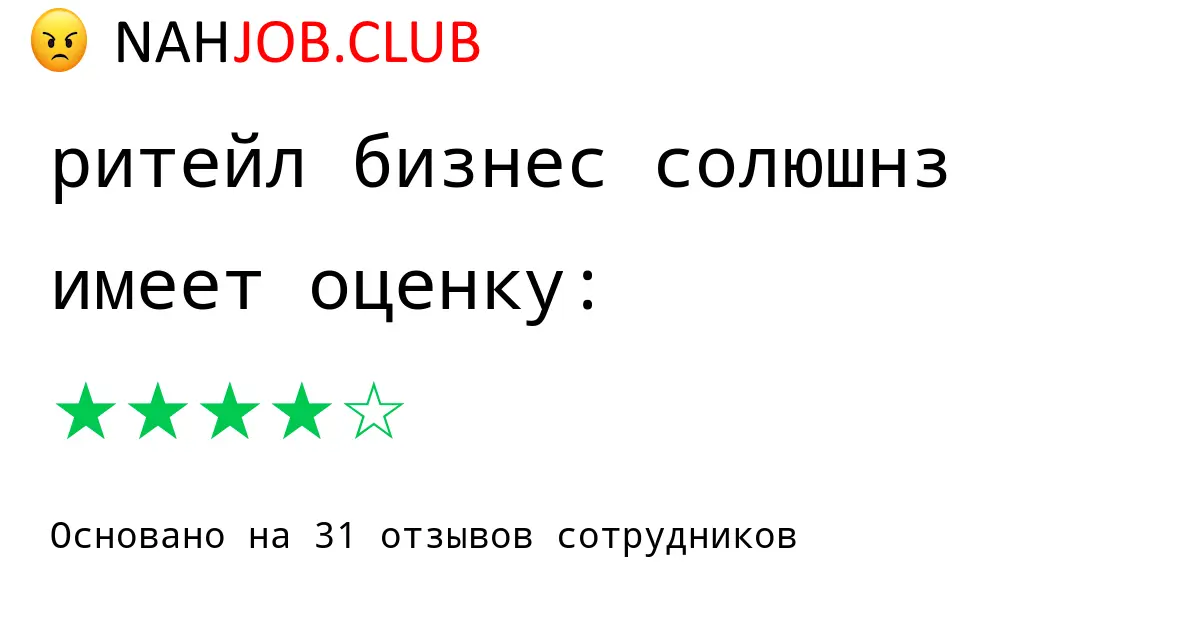 🔴 Мы собрали 31 отзыв бывших сотрудников про РИТЕЙЛ БИЗНЕС СОЛЮШНЗ с рейтингом 4 из 5 . Это данные изнутри про зарплату, коллектив, штрафы.