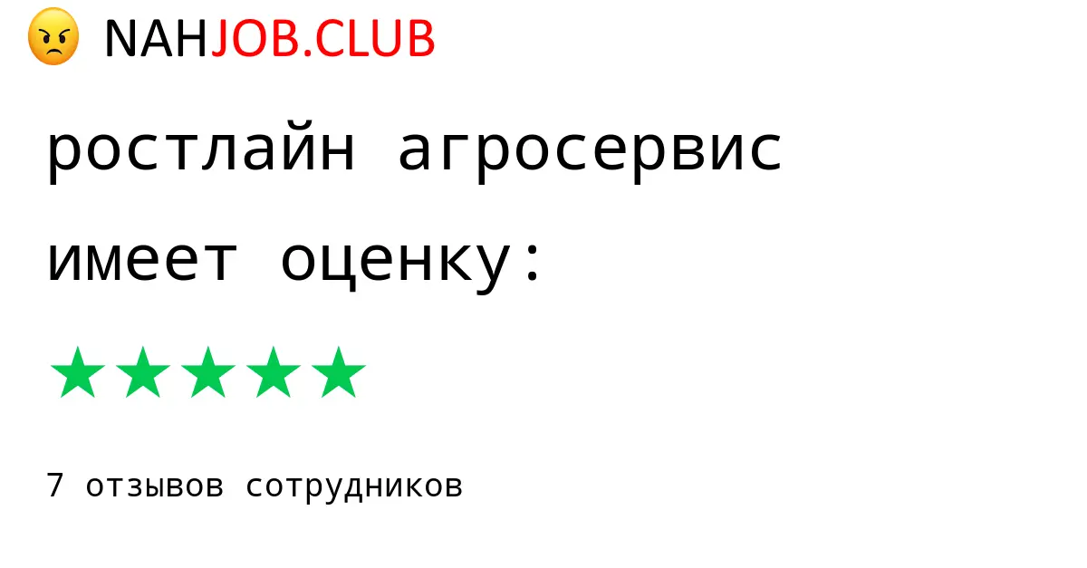 🔴 В базе Nahjob 7 отзывов и мнений бывших и действующих работников про РОСТЛАЙН АГРОСЕРВИС с рейтингом 5 из 5 . Это реальные отклики про зп, атмосферу, штрафы.