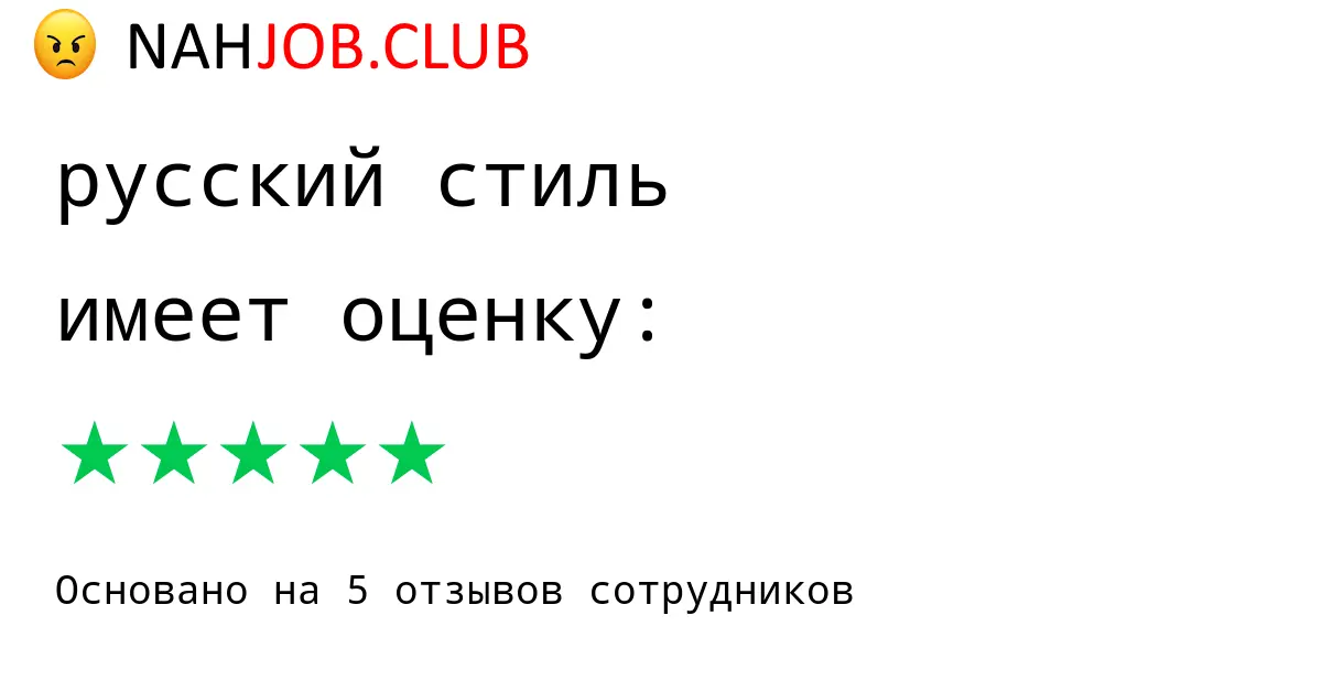 🔴 В базе Nahjob 5 отзывов и мнений бывших и действующих работников про РУССКИЙ СТИЛЬ с рейтингом 5 из 5 . Это реальные отклики про зп, атмосферу, штрафы.