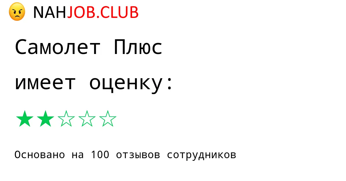 🔴 В базе Nahjob 2 отзыва и мнений бывших и действующих работников про САМОЛЕТ ПЛЮС по городу Уссурийск . Это реальные отклики про зп, атмосферу, штрафы.