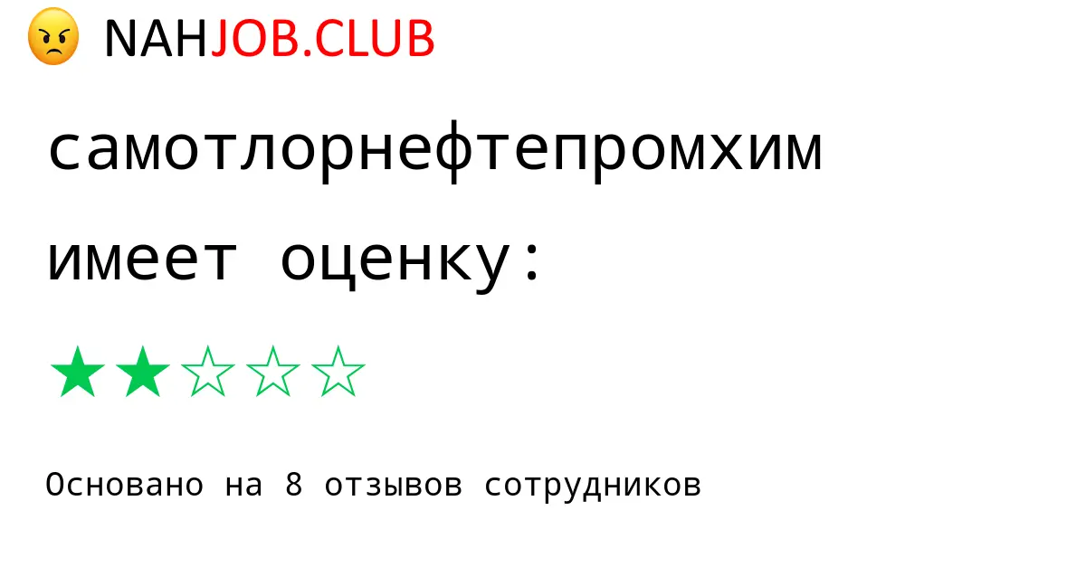 🔴 В базе Nahjob 1 отзыв и мнений бывших и действующих работников про САМОТЛОРНЕФТЕПРОМХИМ с рейтингом 2 из 5 . Это реальные отклики про зп, атмосферу, штрафы.