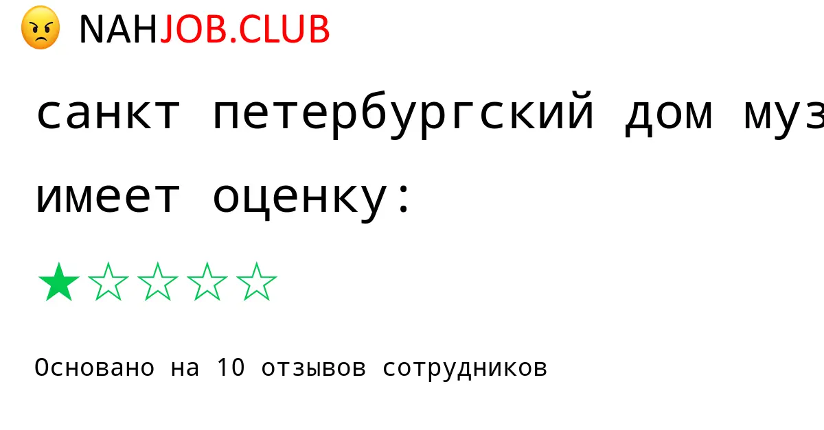 ✓ ПреимуществаВыглядит как работа мечты Далее →✗ НедостаткиНо по факту уже в самих описаниях вакансий на hh можно прочитать между строк намёки на неадекватность, которая подтверждается их фирменным интервью по телефонному звонку. Звонит очень неприятная женщина в возрасте и задаёт глупые вопросы, и, не дослушав до конца, тут же даёт вам негативную оценку. То есть что бы вы не ответили — никогда не будет являться верным. Если я говорю, что разбираюсь в музыке, потому что я музыкант, она тут же перебивает: «У нас вы играть не будете». Да мне, собственно, есть где играть, я и не претендую, политика Дома Музыки мне известна. В вашем резюме будет плохо и неправильно всё, даже если оно соответствует требованиям. Ну, а если вам повезёт, и вас пригласят на собеседование, то, судя по предыдущим отзывам, не ходить и сохранить свою психику здоровой. Далее →