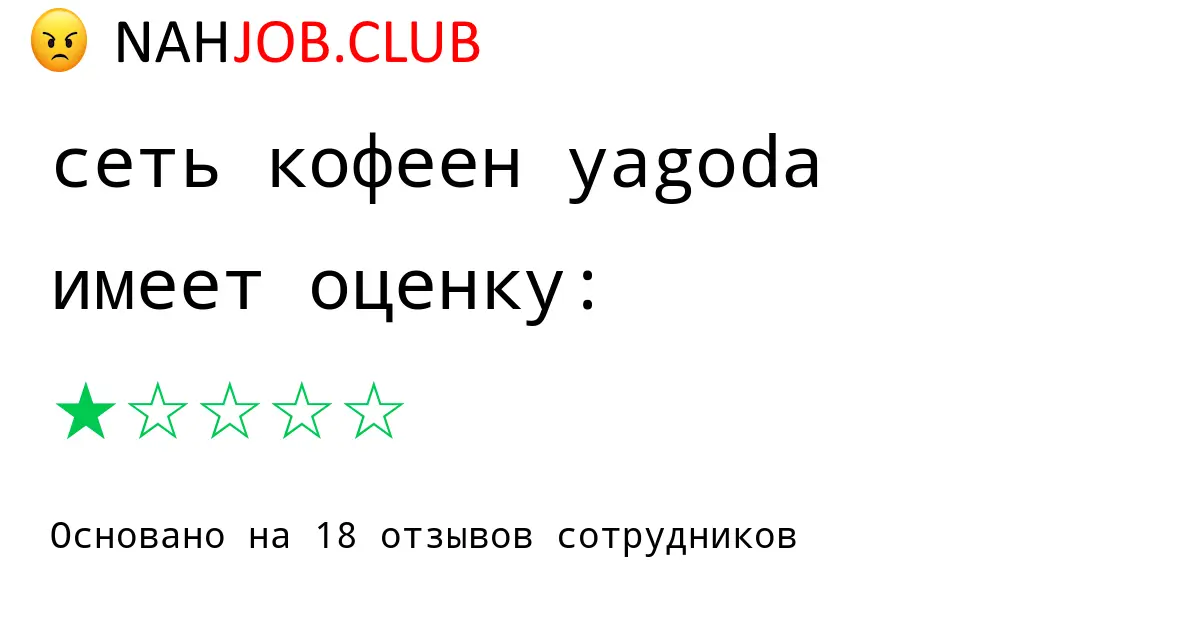 🔴 Мы собрали 18 отзывов бывших сотрудников про СЕТЬ КОФЕЕН YAGODA с рейтингом 1 из 5 . Это данные изнутри про зарплату, коллектив, штрафы.
