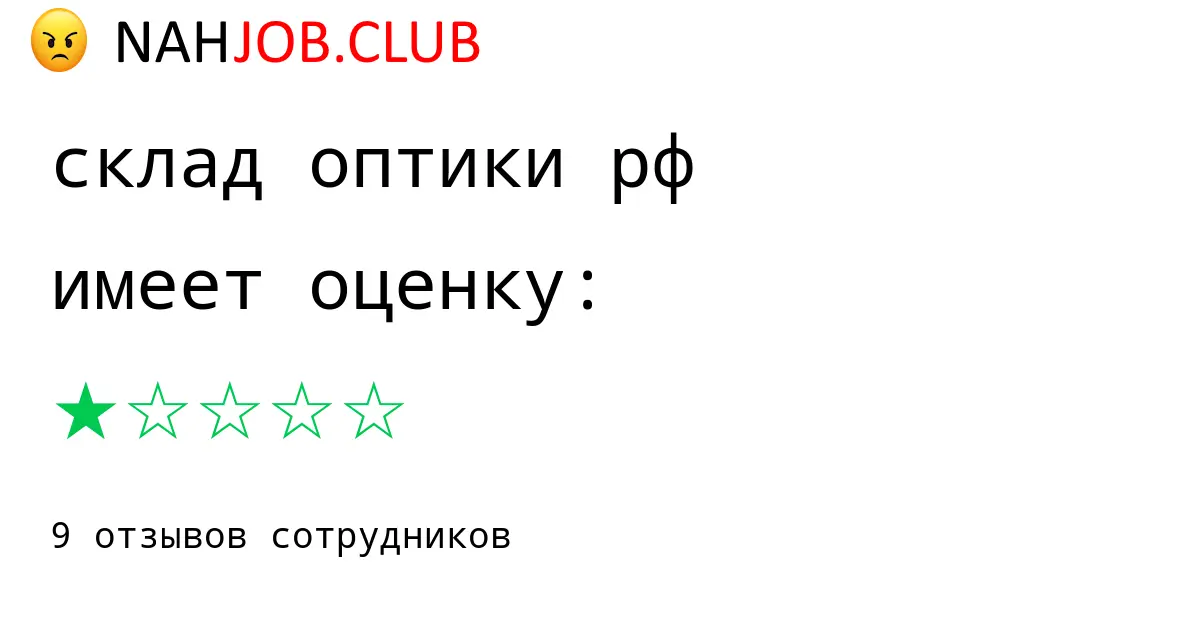 🔴 В базе Nahjob 9 отзывов и мнений бывших и действующих работников про СКЛАД ОПТИКИ РФ с рейтингом 1.3 из 5 . Это реальные отклики про зп, атмосферу, штрафы.