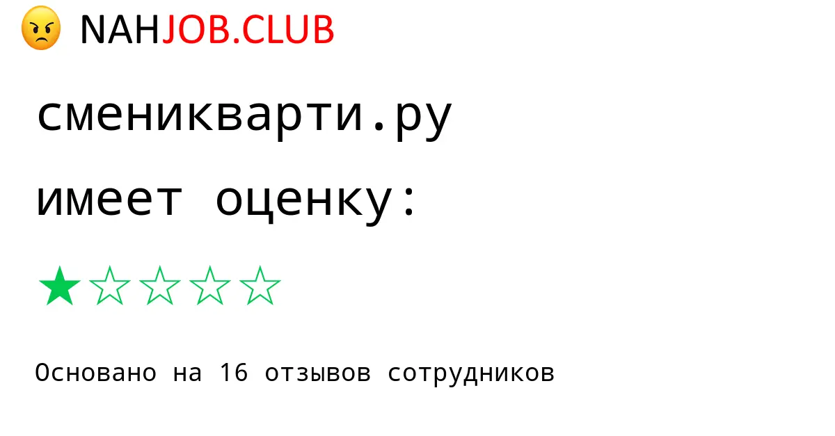 🔴 В списке 16 отзывов бывших работников про СМЕНИКВАРТИ.РУ с рейтингом 1 из 5 . Это искренние мнения про атмосферу, доходы, штрафы, отпуска.