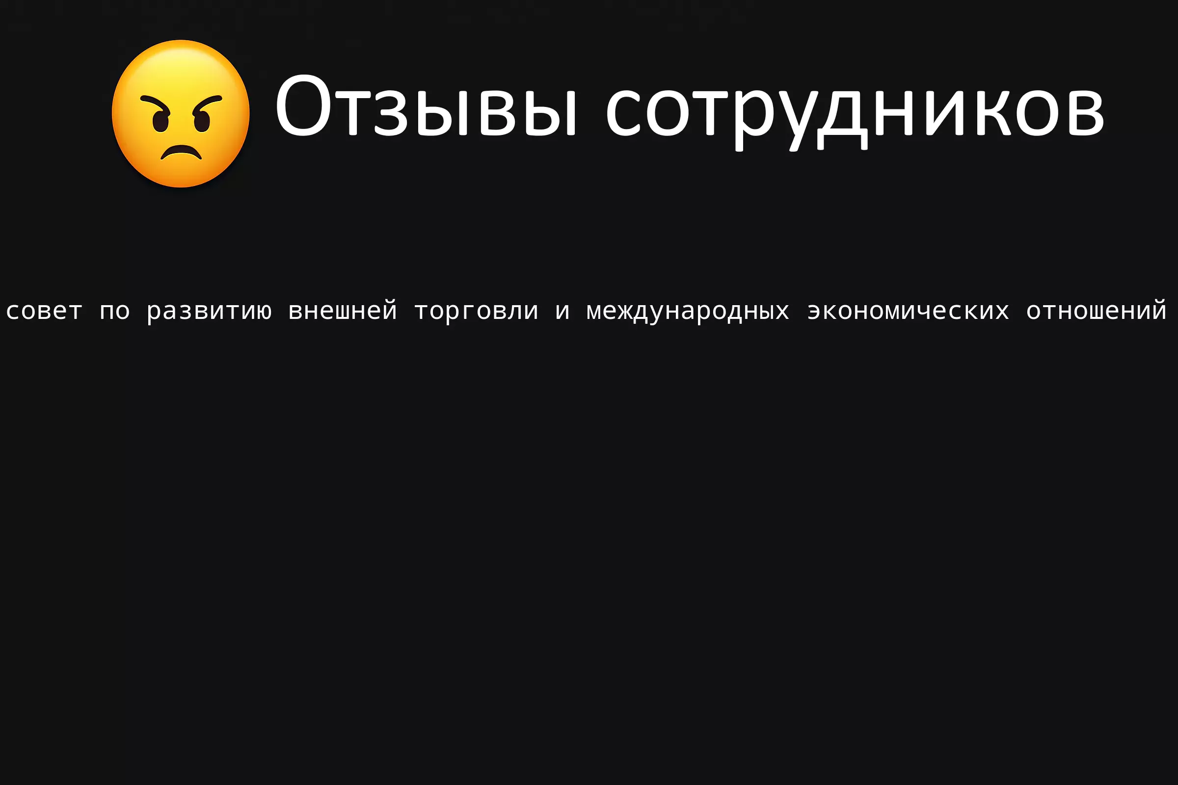 🔴 Изучаете вакансию топ-менеджмент компании СОВЕТ ПО РАЗВИТИЮ ВНЕШНЕЙ ТОРГОВЛИ И МЕЖДУНАРОДНЫХ ЭКОНОМИЧЕСКИХ ОТНОШЕНИЙ? Почитайте 1 отзыв бывших сотрудников про работу по должности Топ-менеджмент в СОВЕТ ПО РАЗВИТИЮ ВНЕШНЕЙ ТОРГОВЛИ И МЕЖДУНАРОДНЫХ ЭКОНОМИЧЕСКИХ ОТНОШЕНИЙ