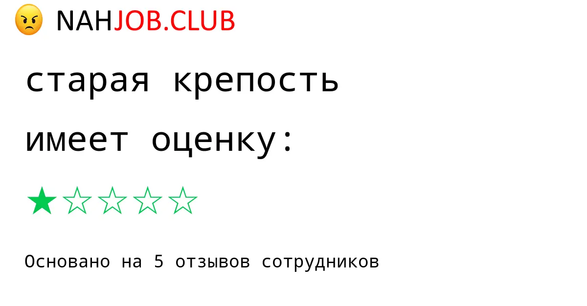 🔴 Мы собрали 5 отзывов бывших сотрудников про СТАРАЯ КРЕПОСТЬ с рейтингом 1 из 5 . Это данные изнутри про зарплату, коллектив, штрафы.