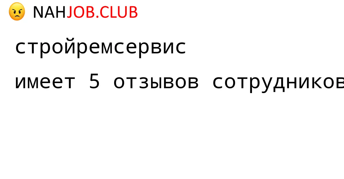 🔴 В базе Nahjob 5 отзывов и мнений бывших и действующих работников про СТРОЙРЕМСЕРВИС. Это реальные отклики про зп, атмосферу, штрафы.