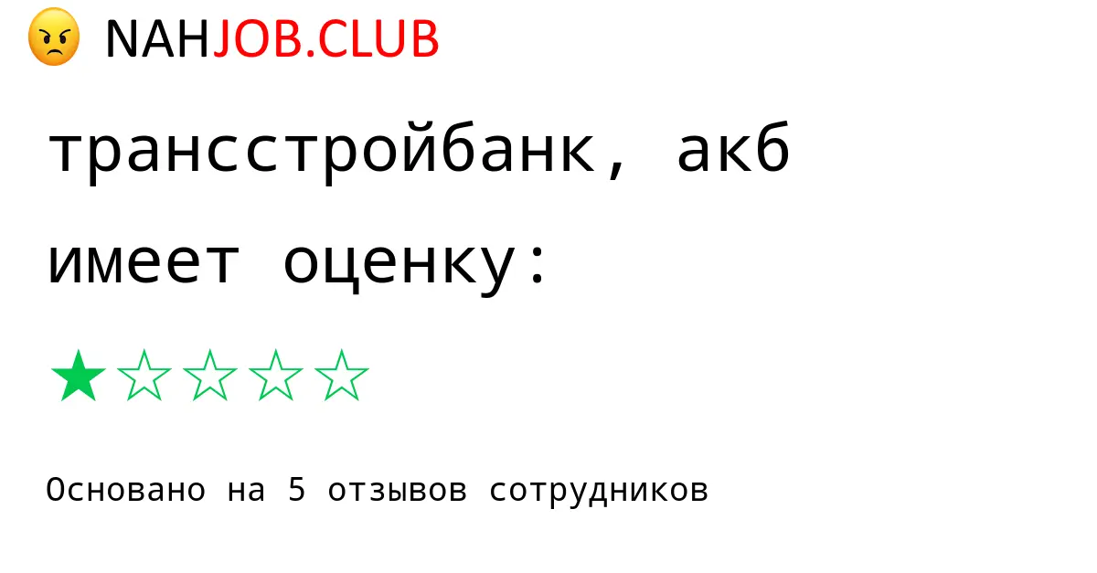 🔴 В списке 5 отзывов бывших работников про ТРАНССТРОЙБАНК, АКБ по городу Москва с рейтингом 1 из 5 . Это искренние мнения про атмосферу, доходы, штрафы, отпуска.