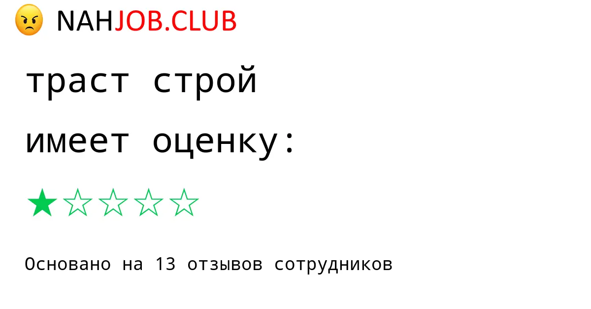 🔴 Мы собрали 1 отзыв бывших сотрудников про ТРАСТ СТРОЙ по городу Орск с рейтингом 1 из 5 . Это данные изнутри про зарплату, коллектив, штрафы.